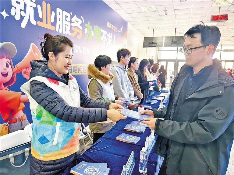 工作人員為求職畢業(yè)生發(fā)放就業(yè)創(chuàng)業(yè)政策宣傳手冊(cè)。